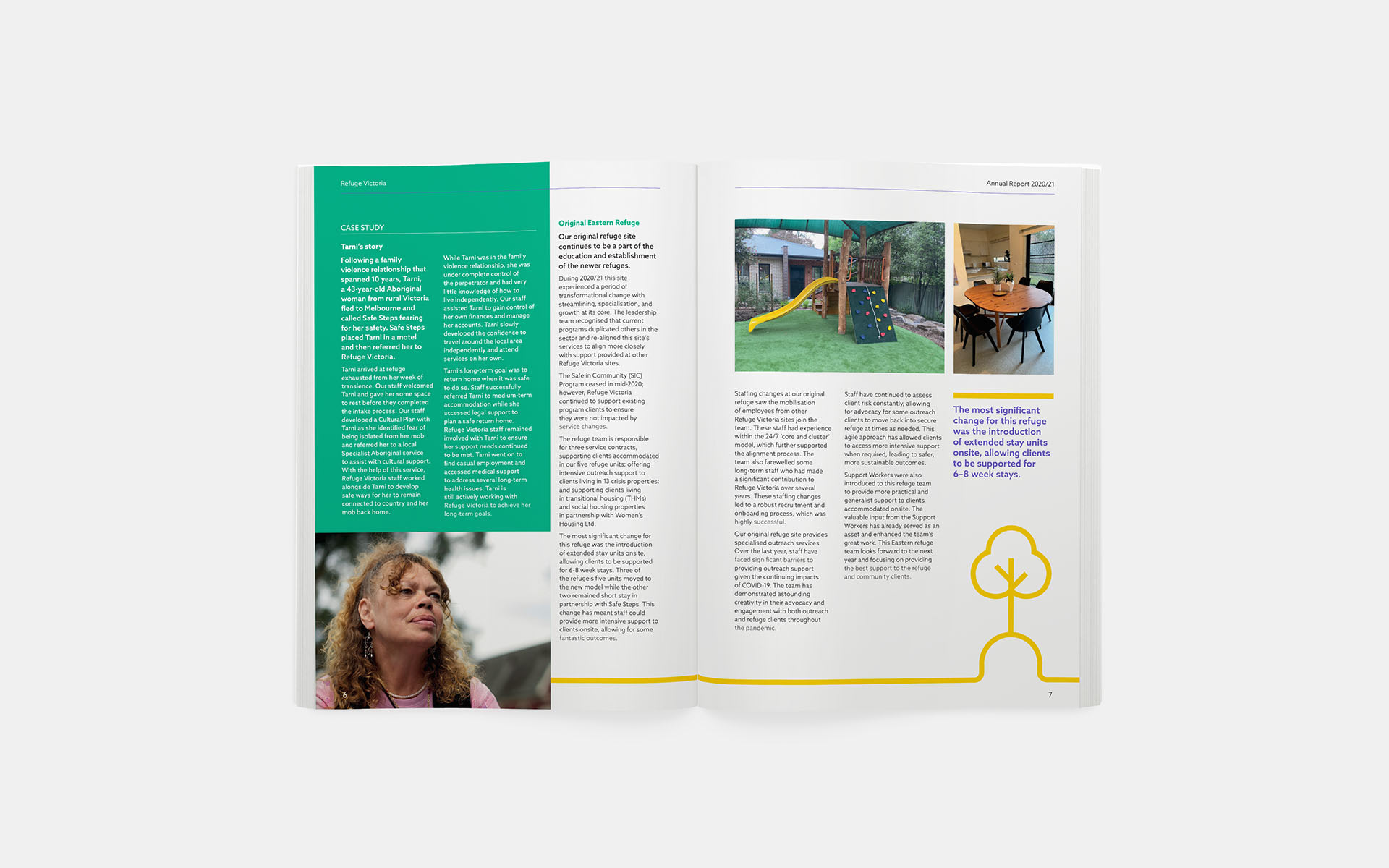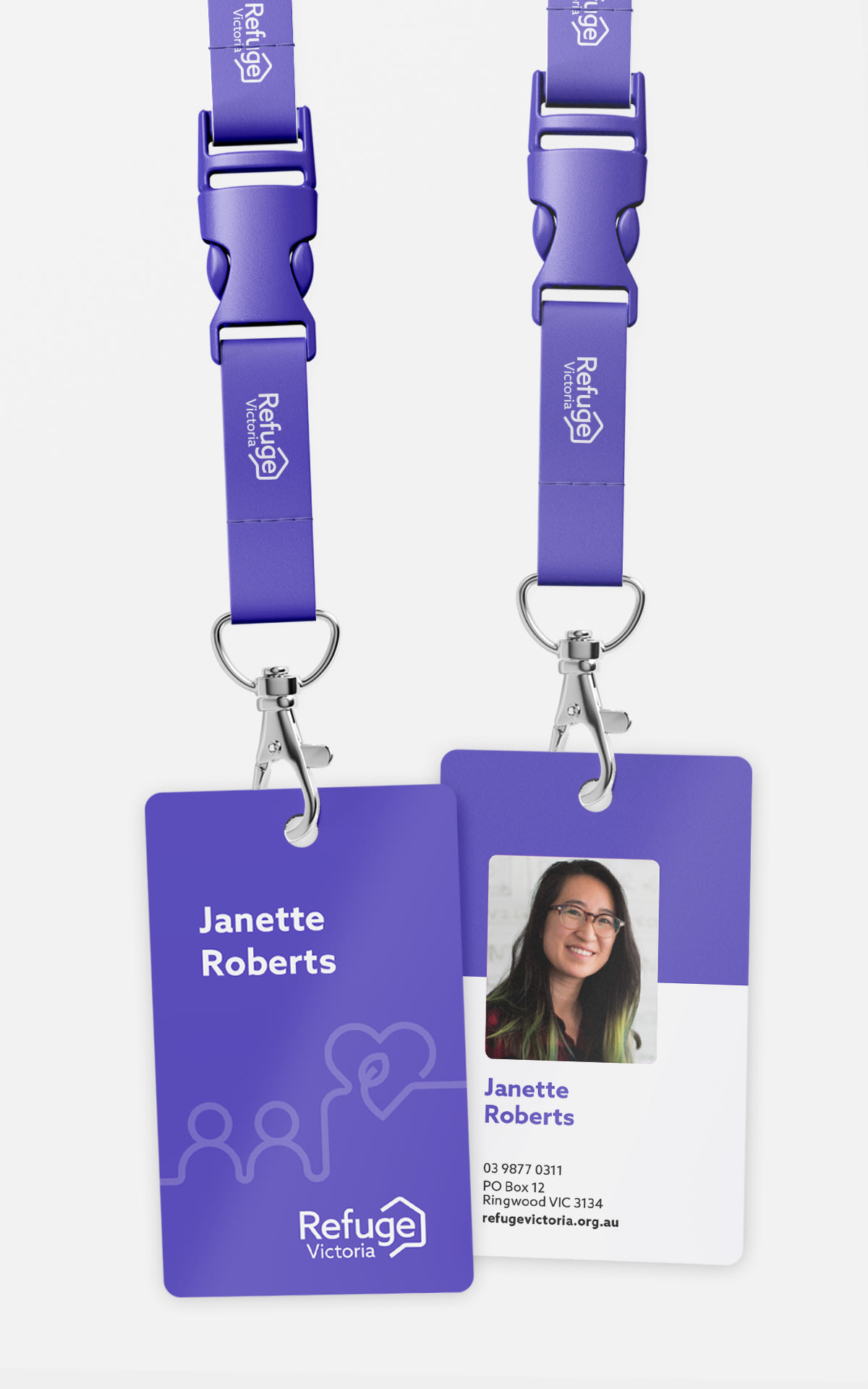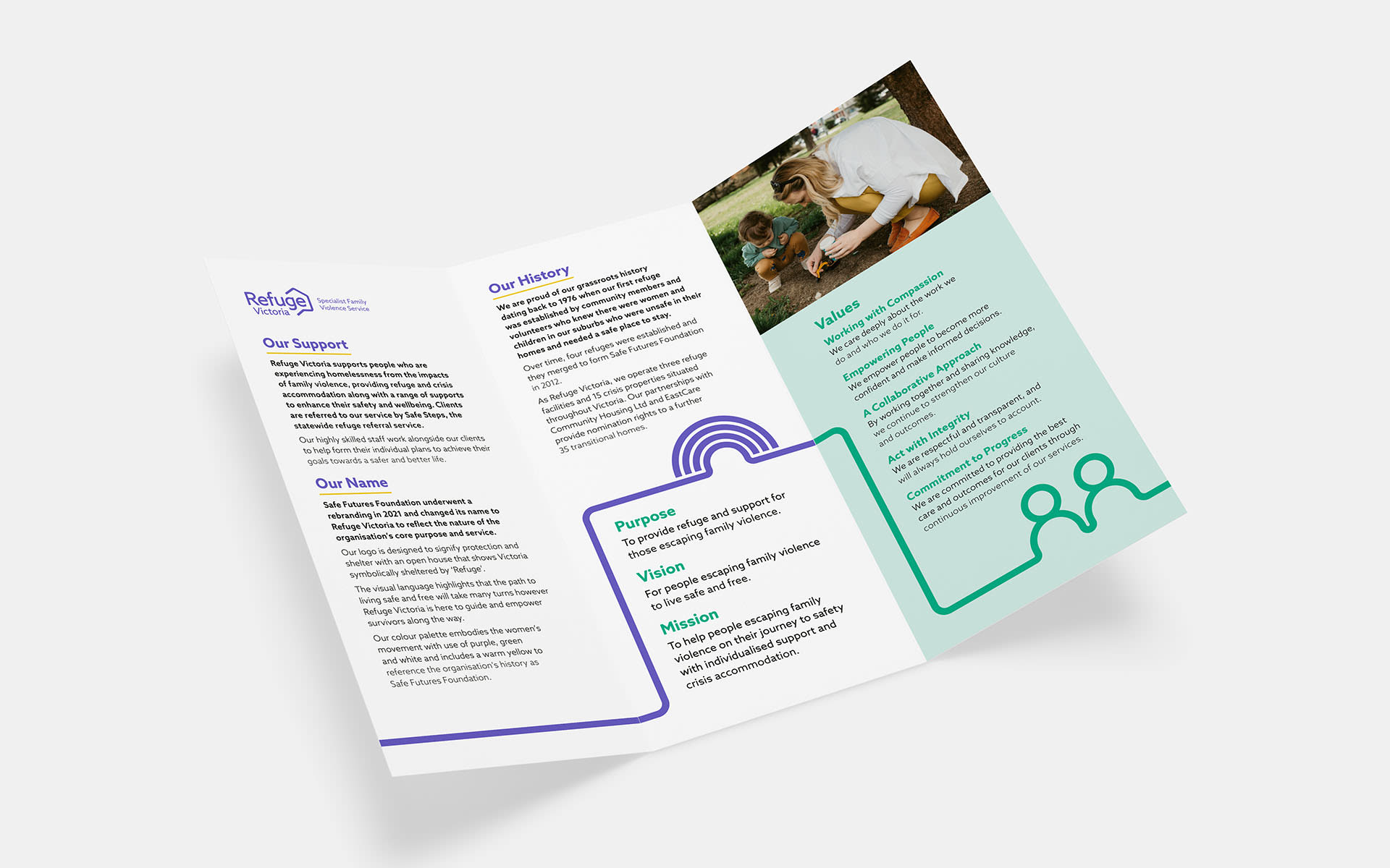 The resulting logo signifies protection and shelter with an open house that shows Victoria symbolically sheltered by ‘Refuge’. The new brand’s colour palette of purple, green and white reflect the Women’s Liberation Movement.